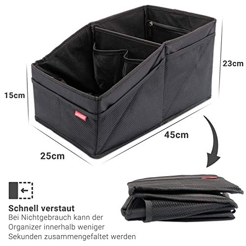 SCHNELL EINGEBAUT UND SCHNELL VERSTAUT – Der Auto Organizer kommt im platzsparenden Design und lässt sich innerhalb weniger Sekunden auseinander- und bei Bedarf auch wieder zusammenfalten. Dabei besitzt er keine Einzelteile wie Trennwände etc. und bleibt so stets vollständig. Für zusätzlichen Halt, kann der Organizer mit dem Sicherheitsgurt festgeschnallt werden.