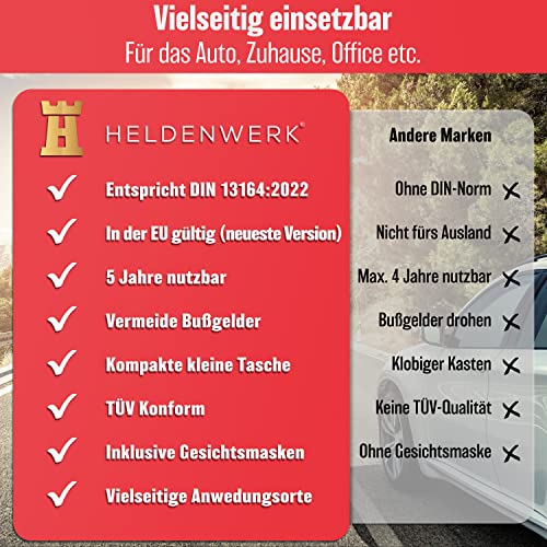 Details: HELDENWERK KFZ Verbandstasche nach aktueller Norm 2023 DIN 13164:2022 (StVO konform) – Europaweit Nutzbar – Erste Hilfe Set Auto Verbandskasten Auto 2023 für TÜV Geprüft