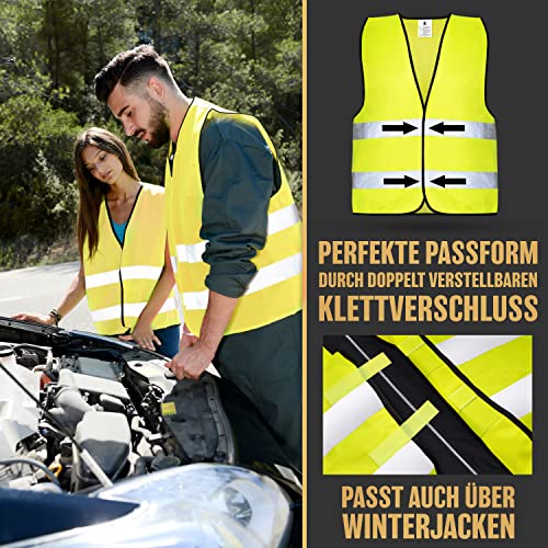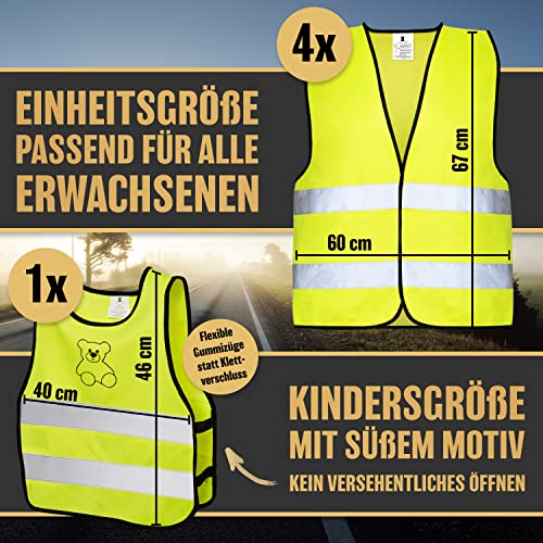 INKL. KINDERWARNWESTE (4+1) – Die Warnwesten für Erwachsene mit integriert verstellbarem Klettverschluss und Einheitsgröße (Universalgröße), lassen sich sowohl auf dicken Jacken sowie leichter Bekleidung tragen. Die Kinderwarnweste bietet maximalen Trageschutz dank Gummizug.