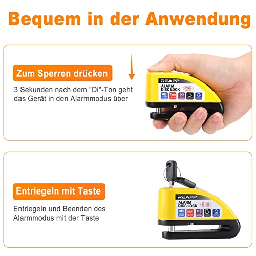 🏍【Thieves ‚ Alptraum】REAPP bremsscheibenschloss alarm ist ein Muss für diebstahlschutz von Motorrad und Fahrrad im Innen- und Außenbereich. Es ist mit eingebautem empfindlichen Sensor ausgestattet, sobald Vibration oder Bewegung erkannt wurde, wird es einen kontinuierlichen Alarm von 110 db ausgeben, um alle Diebe zu stoppen, die versuchen, Ihre Fahrzeuge zu bewegen oder das Schloss zu knacken.