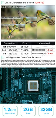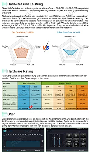 【System】Android Betriebssystem, Hauptprozessor(CPU): Quad Core Prozessor, Interner Speicher (ROM): 32GB, Arbeitsspeicher (RAM): 2GB, mehr Speicher für Apps-Installtion. 9 Zoll hochauflösender 1280 x 720 Pixel Display. DAB+, Kamera, OBD usw. sind optional muss man zusätzlich kaufen.