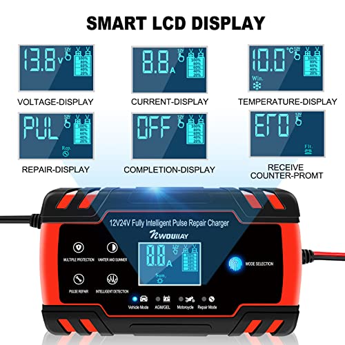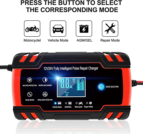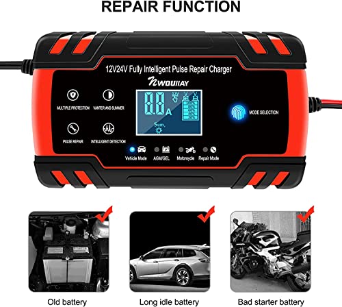 Breites Anwendungsspektrum: Kompatibel mit 12V-24V 4AH-120AH Blei-Säure-Batterien (AGM, GEL, MF, SLA, VRLA) oder allen gängigen Automobil-, Deep Cycle-, Marine- oder wartungsfreien Batterien. Hinweis: Die Verwendung von Lithiumbatterien ist verboten. Geeignet für Motorräder, Rasenmäher, Beachbikes, Autos, Lieferwagen, Lastwagen, SUVs, Boote usw