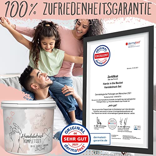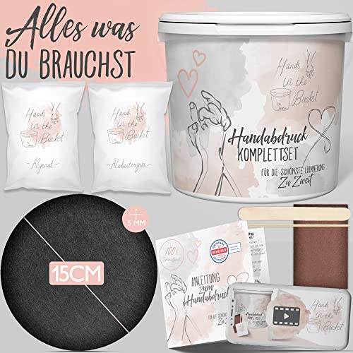 🤍 HANDS IN THE BUCKET: Eimer zum Abformen, 450g ALGINAT, 1000g feinster hochweißer Gips, Korrektur Piekser, Holzschaber, Schleifpapier, schwarzer FILZ-SOCKEL zum Aufstellen des 3D Abdrucks, genaue DIY Anleitung + Video-Anleitung für Hand Gipsabdruck Paar