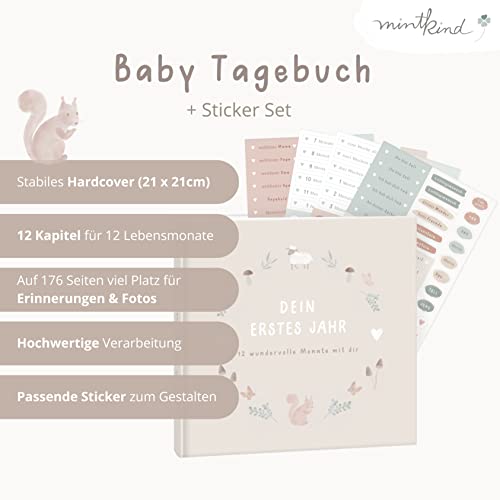 mintkind® Babyalbum „Mein erstes Lebensjahr“ Wald + Sticker Set | Baby Fotoalbum zum Selbstgestalten | Baby Geschenk für Mädchen und Junge | Babybuch zum Eintragen | Baby-Tagebuch ab 0 Monate