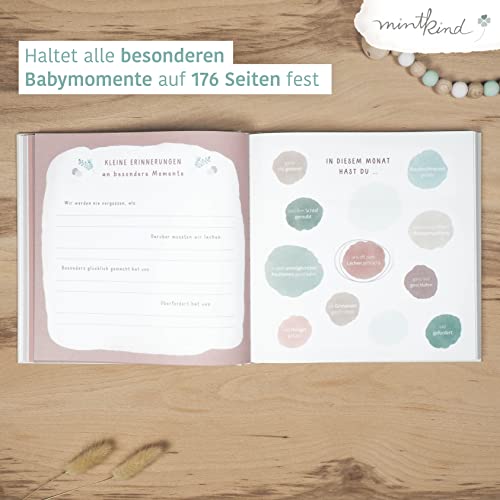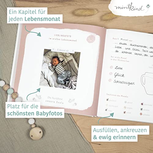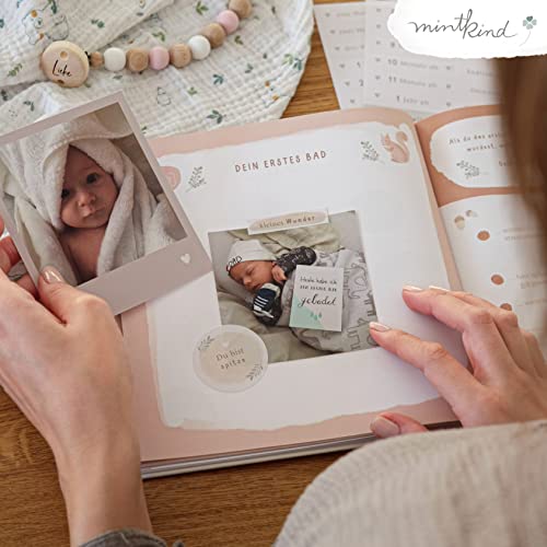 Details: mintkind® Babyalbum „Mein erstes Lebensjahr“ Wald + Sticker Set | Baby Fotoalbum zum Selbstgestalten | Baby Geschenk für Mädchen und Junge | Babybuch zum Eintragen | Baby-Tagebuch ab 0 Monate