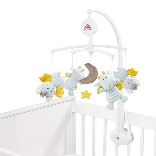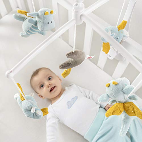 Das Figuren-Mobile bringt Babyaugen zum Leuchten: Die magische Welt des niedlichen Drachen und der frechen Fledermaus in sanftem Blau lädt mit ihrer seichten Melodie „Mozarts Wiegenlied“ zum Lauschen und Staunen ein