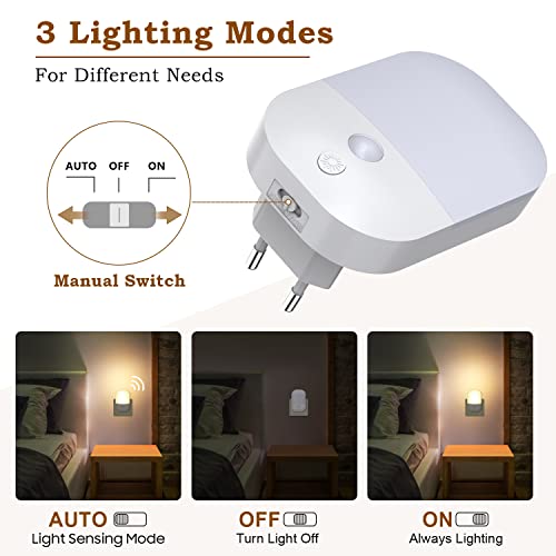 💡 【3 Modi: Auto/Ein/Aus】: Dieses nachtlicht baby hat den Dämmerungssensor, kann die Dunkelheit erkennen und leuchtet automatisch auf. Im AUTO-Modus leuchtet das LED nachtlampe kinder in der Dämmerung, in der Nacht oder bei schlechten Lichtverhältnissen, und es schaltet sich automatisch in der Morgendämmerung, am Tag oder bei guten Lichtverhältnissen aus. Sie können die Modi AUS/EIN auch manuell auswählen, indem Sie den Schalter nach Bedarf verschieben.