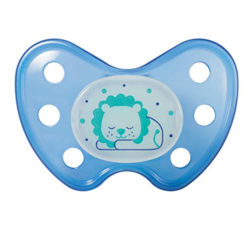 Details: Dentistar Silikon Night Schnuller im 3er-Set – Größe 3 Baby Schnuller ab 14 Monate – Nuckel leuchtet im Dunkeln – Leuchtschnuller mit Dentalstufe – Made in Germany – Löwe, Blau (3 Stück)