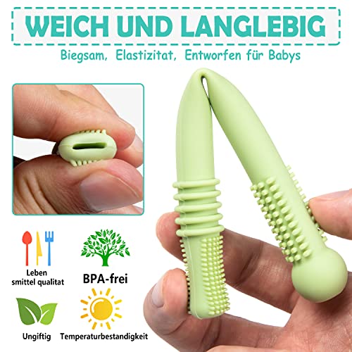 【Lebensmittelgerechtes Material】Zahnungshilfe Baby ist aus hochwertigem lebensmittelechtem Silikon hergestellt, das sicher und ungiftig, BPA-frei, FDA-konform, weich und elastisch ist, das Zahnfleisch Ihres Babys schützt und auf die Sicherheit und das gesunde Wachstum Ihres Babys achtet!