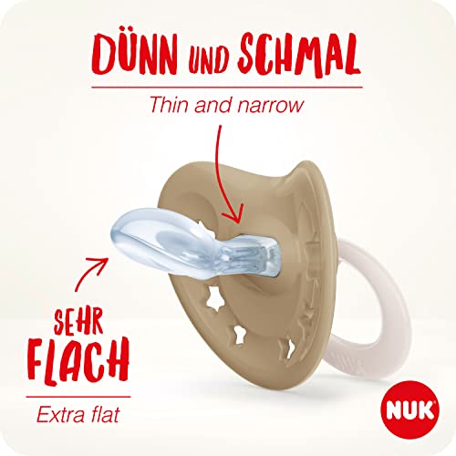 Wie süß! So sieht ein Baby aus, das zufrieden seinem Saugreflex nachgehen kann. Der NUK Signature Schnuller ist die Antwort auf dieses natürliche Bedürfnis und hat gleichzeitig die vollkommen natürliche NUK Form. Das Original. Die einzigartige NUK Form ist der Mutterbrust beim Stillen nachempfunden, sodass eine gesunde Mundentwicklung gefördert wird. Der NUK Signature Schnuller ist so flach, dünn und schmal, dass er perfekt in den kleinen Mund passt und der Zunge genug Platz für natürliche Saugbewegungen lässt. 100 % der Kieferorthopäden bestätigen, dass NUK Schnuller die richtige Form haben und keine Kiefer- oder Zahnfehlstellungen verursachen.* Jetzt kommt der schon lange beliebte NUK Schnuller mit einem neuen wunderbaren Look daher, der die berühmte herzförmige Mundplatte noch weicher macht. Der Ring wurde liebevoll modernisiert, damit das kleine Gesicht noch süßer wirkt. Die in verschiedenen süßen Designs erhältlichen NUK Schnuller werden mit einer stabilen Box geliefert, die den Schnuller sauber hält und schützt – vor allem für unterwegs eine ideale Lösung, um sie jederzeit parat zu haben. Die Plastikbox kann auch zum Sterilisieren von Schnullern in der Mikrowelle verwendet werden. *Unabhängige Marktforschung, 50 Kieferorthopäden, 50 Kinderärzte und 50 Hebammen; Deutschland 2017