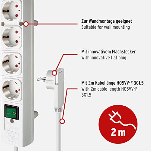 Brennenstuhl Comfort-Line Plus, Steckdosenleiste 4-Fach (Steckerleiste mit Flachstecker und Schalter, Mehrfachsteckdose mit 2m Kabel und extra Breiten Abständen der Steckdosen) weiß