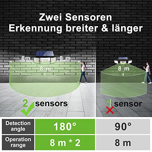 【2 PIR Sensor-3 Beleuchtungsmodi】Wasserdichte lampe solar bewegungsmelder mit Dual-Sensor-Design erkennt Bewegungen über einen viel größeren Bereich als Einzelsensor-Modelle und bieten eine 180-Grad-Bereichserkennung, Die Erkennung reicht lockere 10-16 Meter . Gleichzeitig Solarleuchten hat 3 Beleuchtungsmodi für Ihre Wahl,Erfüllen Sie Ihre unterschiedlichen Anforderungen.