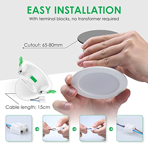 ✅【Einfache Installation】LED Einbaustrahler 68mm ohne Trafo mit nur 29mm Einbautiefe, ALUSSO ultra slim Einbauleuchten, Durchmesser Ø 85mm, Lochmaß Ø 65-80mm, Kabellänge 150mm, Klemmenblöcke im Lieferumfang. LED Deckenspots Dimmbar 230V mit Integrierter Trafo, direkt an 230V angeschlossen, keine Transformatoren oder Zubehör erforderlich. LED Einbauspots können leicht in Minuten montiert werden, auch wenn Sie ein Anfänger sind.