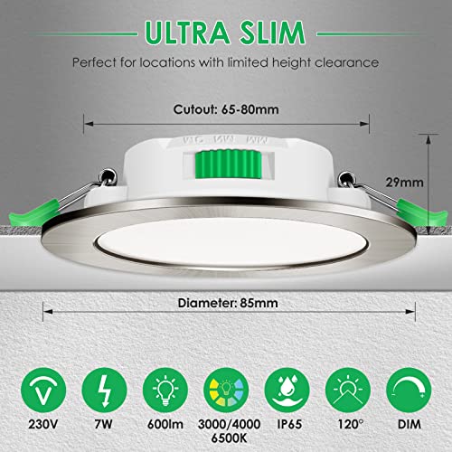 Details: ALUSSO Einbaustrahler LED Flach 230V Spots Dimmbar 7W IP65 Bad Einbauleuchten 68mm Deckenspots, Warmweiß Neutralweiß Kaltweiß Einbauspots Deckenstrahler für Badezimmer Küche Wohnzimmer, 6er Set