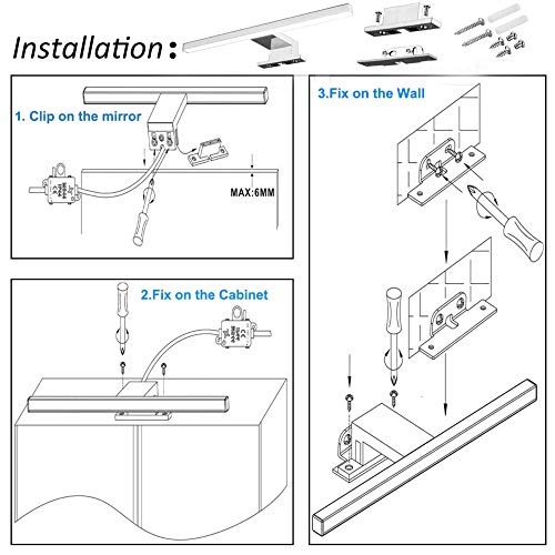 🔧【Praktisches Design mit 3 Montagemöglichkeiten für diese Spiegelfrontleuchte】supplied Dank der mitgelieferten Montageklemme kann diese Spiegellampe an Schränken oder an der Wand befestigt werden. Sie kann jedoch auch als Anbaulampe direkt am Spiegel angebracht werden. Die vorgebohrte und abnehmbare Halterung ermöglicht die einfache und variable Montage an jedem Möbelstück.