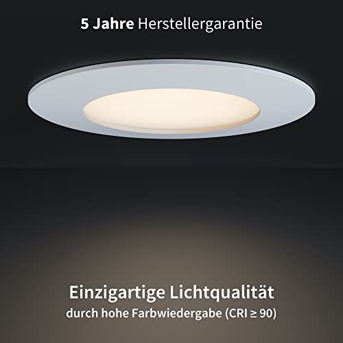 5 Jahre Herstellergarantie, auch auf das Leuchtmittel. Technische Eckdaten: Lochmaß 60 – 70mm, Einbautiefe 26mm, 230V, 4,5W, 500lm, warmweißes Licht (3000K), CRI ≥90, 110° AW, geeignet für Innenräume (Wohnzimmer, Bad, Küche, Flur, Büro)