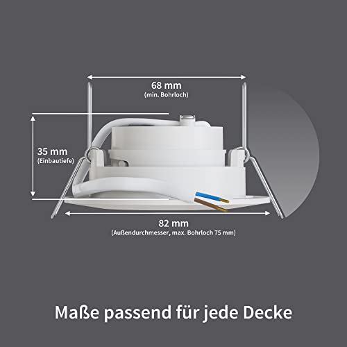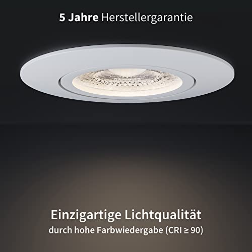 5 Jahre Herstellergarantie, auch auf das Leuchtmittel. Technische Eckdaten: Lochmaß 68 – 75mm, Einbautiefe 35mm, 230V, 4,3W, 350lm, warmweiß (3000K), CRI ≥90, 44° AW, schwenkbar ±30°, geeignet für Innenräume (Wohnzimmer, Bad, Küche, Flur, Büro)