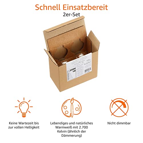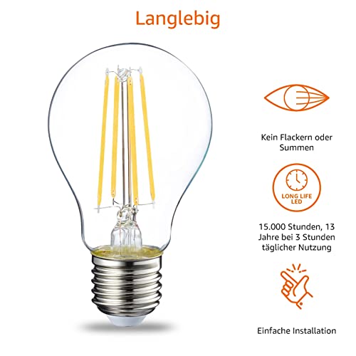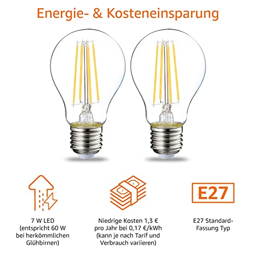 Details: Amazon Basics LED-Leuchtmittel, Edison-Sockel E27, 7 W (entspricht 60-W-Glühbirne), nicht dimmbar, klares Filament, 2 Stück