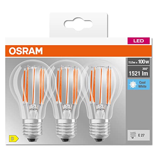 Details: OSRAM Lamps LED BASE Classic A100, klare Filament LED-Lampen aus Glas für E27 Sockel, Birnenform, Kaltweiß (4000K), 1521…