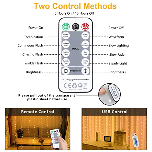 ✨【USB Powered & Timing】Die LED lichtervorhang mit einem USB-Stecker entworfen, ermöglicht es Ihnen, bequem direkt über Computer, Powerbank und andere USB-Geräte aufzuladen. Die LED lichterketten vorhang hat eine Timing-Funktion. Wenn Sie die „TIMER“-Taste auf der Fernsteuerung drücken, ist das Licht 6 Stunden lang an und 18 Stunden lang aus. Drücken Sie die Ein-Aus-Taste erneut, um diese Funktion abzubrechen.