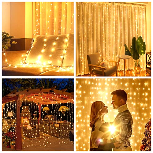 ✨【3M*3M Lichtervorhang mit Hook】3×3 Meter mit 300 Warmweiße LEDs, mit USB gesteuert und fernbedienung. 300 LEDs verteilen auf 10 Strängen, jeder Strang hat 30 LED Lichtquellen und ist in einem Abstand von etwa 10cm voneinander angeordnet. Ausgestattet mit 10 haken können sie an wand, fenster, tür, decke usw. hängen, schafft einen schönen Wasserfall-Effekt.
