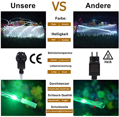 【Lichterkette Strombetrieben Wasserdicht】Mit der Schutzart IP68 ist es vor Spritzwasser geschützt.Deshalb können Sie diesen Schlauch ohne Angst über den Regen außen installieren. Stecker ist IP44 und sollte für den Außenbereich geschützt warden