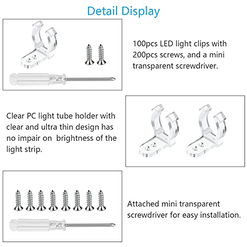Details: LOPOTIN 100 Stück Befestigungsclips Lichtschlauch LED Strips Clips mit 200 Schrauben 1 Kreuzschlitzschraubendreher Halterung Lichterschlauch Transparenten Lichtclips Befestigung