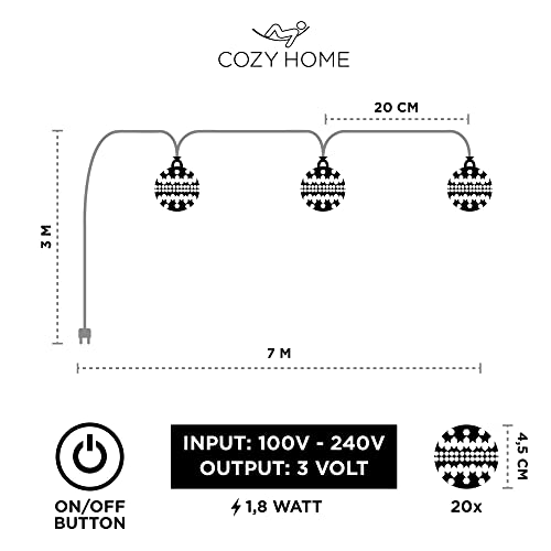 CozyHome Marokkanische LED Lichterkette Innen mit Stecker – 7 Meter & 20 LED in Warm Weiß I Lichterketten Marokkanisch marrokanisch I warmweiß warmweiss für Zimmer Strom Netzstecker fairy lights