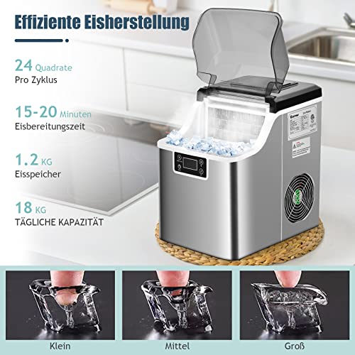 🧊Große Eiswürfelproduktion und -speicherung: Diese Cube Maschine kann bis zu 18 kg/24 Std. Eiswürfel machen, Eisherstellung in 15-20 Minuten abschließen, und kommt mit Eiskorb mit Kapazität von 1,2 kg, sodass sowohl Eiswürfelspeicher als auch Eiswürfelproduktion groß und für Familien geeignet sind.