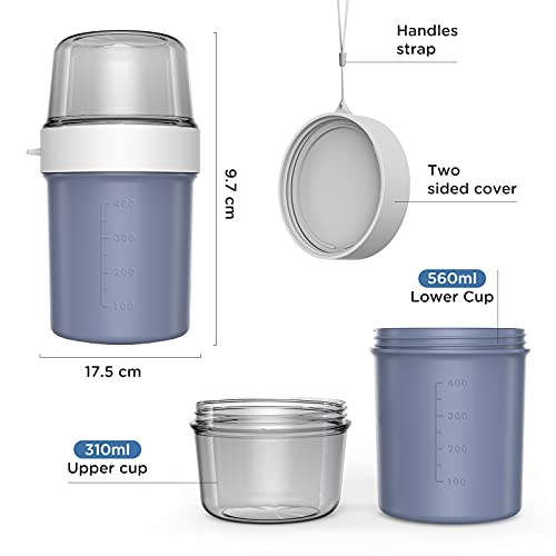 Praktischer Müslibecher—-Der Vielseitige essensbehälter hat eine seitlich aufgedruckte Skala, die es Ihnen leicht macht, leckere Lebensmittel zuzuordnen. Der obere Teil des Müslibox to go kann mit Salatdressing, Nüssen und Haferflocken gefüllt werden, während der untere Teil des Joghurtbecher perfekt für Joghurt, Salate, Obst und Snacks geeignet ist, mischen Sie nach Belieben, damit Ihr Frühstück nicht mehr eintönig ist!
