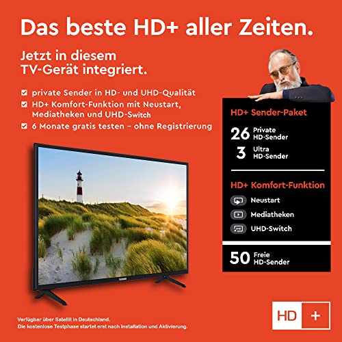 BEEINDRUCKENDE BILDER – Erleben Sie Inhalte in moderner Full-HD-Auflösung und testen Sie für 6 Monate kostenfrei und ganz unverbindlich das HD+ Paket (SAT-Empfang benötigt). Der TV unterstützt außerdem HDR 10 inkl. HLG und liefert damit besonders kontrastreiche Aufnahmen mit einer natürlichen Farbgebung und beeindruckender Detailschärfe. Ihr Fernseherlebnis wird dadurch noch realistischer.