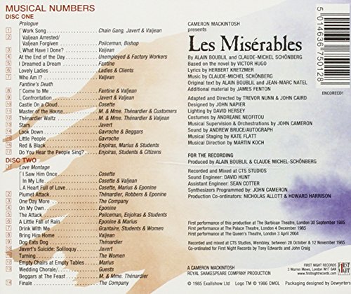 Weit über 50 Millionen Menschen haben das Stück in 38 Ländern und 227 Städten gesehen. Es wurde in 23 Sprachen übersetzt. Unter seinen mehr als 50 internationalen Auszeichnungen finden sich 8 Tony-Awards, der „Oscar“ der Musical-Szene. „Les Misérables“ war im Rahmen eines Gastspiels in Shanghai 2002 das erste westliche Musical, das in China aufgeführt wurde. Es ist das erste Stück, dessen Aufführungsrechte als spezielle „Schul-Version“ erhältlich sind: Die Liste der Superlativen zu „Les Misérables“ ist fast endlos. Die Doppel-CD „Original 1985 London Cast Recording“ enthält die erste englischsprachige Aufnahme des ergreifenden, zum Niederknien schönen Werks von C-M. Schönberg und A. Boubill. Das Stück wird heute noch am Queen’s Theatre gespielt. Die Doppel-CD enthält auch Video-Material. Unter anderem singt Colm Wilkinson „Bring Him Home“ und Alun Armstrong & Jenny Galloway interpretieren „Master of the House“.
