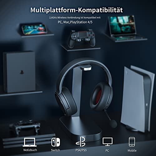 [Multiplattform-Kompatibilität] Ihr Gaming Kopfhörer ist mit 2 kabellos Verbindungstypen für Multiplattform-Kompatibilität ausgestattet. 2,4GHz kabellos-Verbindung ist kompatibel mit PC, PlayStation 4/5, Laptops. Bluetooth Verbindung ist kompatibel mit Handys, Tablets und anderen Geräten mit Bluetooth-Audio-Funktion.(Bitte überprüfen Sie die Verbindungsanweisung für Kompatibilität in der Bedienungsanleitung).