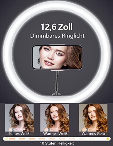 12,6 Zoll Dimmbare Ringlicht: Nehmen Sie spezielle LED-SMD-Design und gekrümmte Lichtabdeckung, das Licht ist gleichmäßiger und weicher, nehmen Sie alle ungeschminkt Schatten macht Ihr Selfie mehr Charme. Das große Ringlicht bietet besseres Fülllicht und ist ein professionelles Werkzeug für die Erstellung von Videos, Live-Streaming, Make-up oder Selfie-Fotos. 3 Lichtmodi: weißes, natürliches und warmes Licht, und jeder Modus hat 10 Stufen Helligkeit (Farbtemperatur: 3000K-6500K).