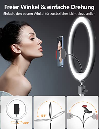 Beliebige Drehung:Dank des benutzerfreundlichen Designs des 360-Grad-Kugeldrehgelenks zwischen Stativständer und Ringleuchte können Sie ganz einfach jeden Winkel einstellen, um den besten Winkel für das Füllen Licht zu bekommen. Unterstützung 5,7 cm – 8,4 cm Breite Smartphone. Der verbesserte Telefonhalterschlauch ist weich genug, damit die Feder des Telefonhalters leicht in jede Richtung gedreht werden kann.