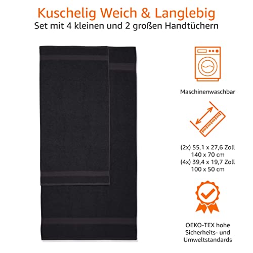 Amazon Basics Handtuch-Set, ausbleichsicher, 2 Badetücher und 4 Handtücher, schwarz, 100 Prozent Baumwolle 500g/m²