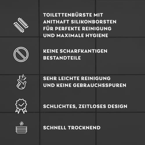 SCHNELLE TROCKNUNG – Dank der antihaftbeschichteten & flexiblen Borsten aus hochwertigem Silikon trocknet Deine Klo Bürste nicht nur im Handumdrehen, sondern ist zudem leicht zu reinigen und resistent gegen Beschädigungen.