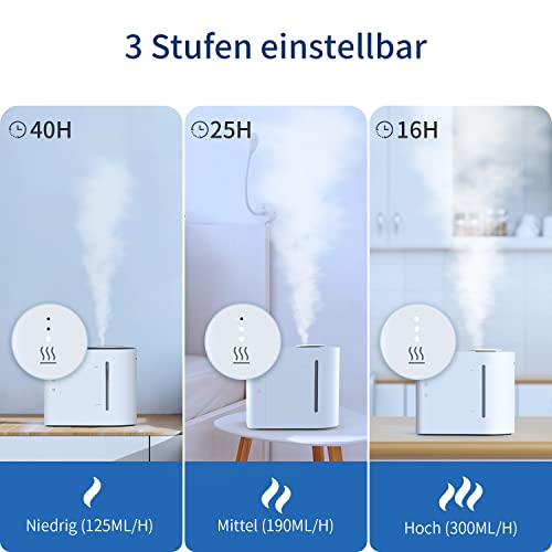 [ Einstellbarer Nebelausgang & Schnell aus dem Nebel ] Der Nebelauslass kann flexibel von 125 bis 300 ML/H geändert werden, um die beste Luftfeuchtigkeit zwischen 30 % und 60 % zu halten. Der HU450 Luftbefeuchter kann in 5 Sekunden beschlagen, um die Luftfeuchtigkeit im gesamten Raum schnell zu erhöhen und allgemeine Allergiesymptome wie Husten, verstopfte Nase, Halsschmerzen und trockene Haut zu lindern.