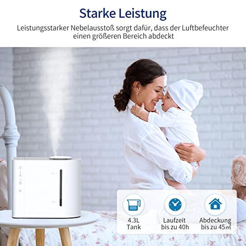 [ Leistungsstarke Befeuchtungskapazität ] Genießen Sie den kühlen Nebel für eine Luftbefeuchtung von 20-45 m² großen Räumen, Kinderzimmern und Umgebungen mit Pflanzen für einen Zeitraum bis 40 Stunden ohne Nachfüllen, dank des kompakten 4.3L Behälters.
