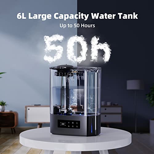 [6L Wassertankkapazität] luftbefeuchter 6L Wassertank mit großem Fassungsvermögen, kann bei einmaligem Befüllen mit Wasser bis zu 60 Stunden lang ununterbrochen verwendet werden, und der Wassertankgriff im Inneren des Luftbefeuchters ist auch praktisch für das Hinzufügen von Wasser