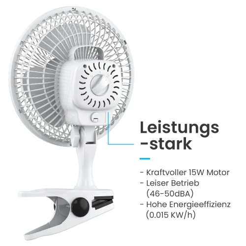 KRAFTVOLLER MINI-VENTILATOR: Mit 20 cm Durchmesser und 15 Watt Motor sorgt der Clip Fan für eine angenehme Abkühlung – dank der robusten Klammer kann dieser an jede Oberfläche, mit einer Breite von bis zu 40 mm, praktisch angebracht werden