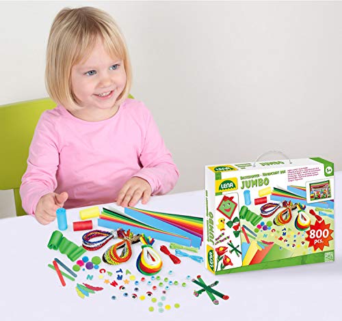 Lena 42629 Bastelkoffer mit vielfältigem Material zum Basteln, mit Moosgummi, Buntpapier, Perlen, Pompon, Satinbänder, Knöpfe, Kulleraugen und vielem mehr, ab 5 Jahre, Jumbo 800er Bunt, 800 Teile