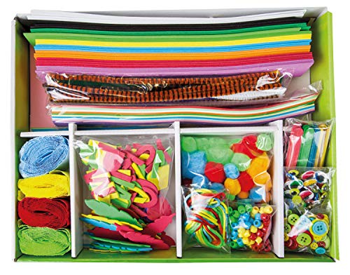 Inklusive: buntem Papier, Pfeifenstopfer, Moosgummi Zuschnitte, Mossgummi Streifen, Moosgummi Federn, Kulleraugen, Pompons, Kreppband, bunte Eiscreme Sticks, Papier Streifen, Satinbänder, Perlen und Knöpfe