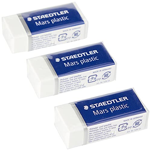 Details: STAEDTLER Radierer Mars plastic, Phtalat- und latexfrei, geringe Krümelbildung, weiß, premium Qualität, geringe Abnutung, 2 Stück und 1 Stück gratis, 526 53 ABK3D