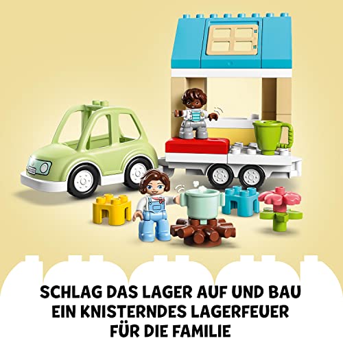 Dieses LEGO DUPLO Town Spielzeug für Kleinkinder ab 2 Jahre enthält ein niedliches mobiles Haus, das an einem Spielzeugauto befestigt werden kann, 2 Figuren und viel Zubehör für lustige Abenteuer