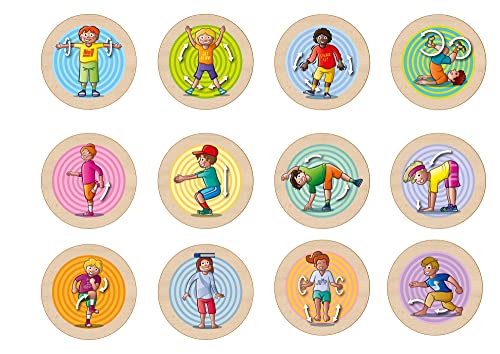 Spiel und Sport – Die Spielscheiben deuten den Kindern bestimmte Übungen und Bewegungen an, die sie spielerisch nachahmen und umsetzen sollen. Natürlich sind hier der eigenen Kreativität keine Grenzen gesetzt.